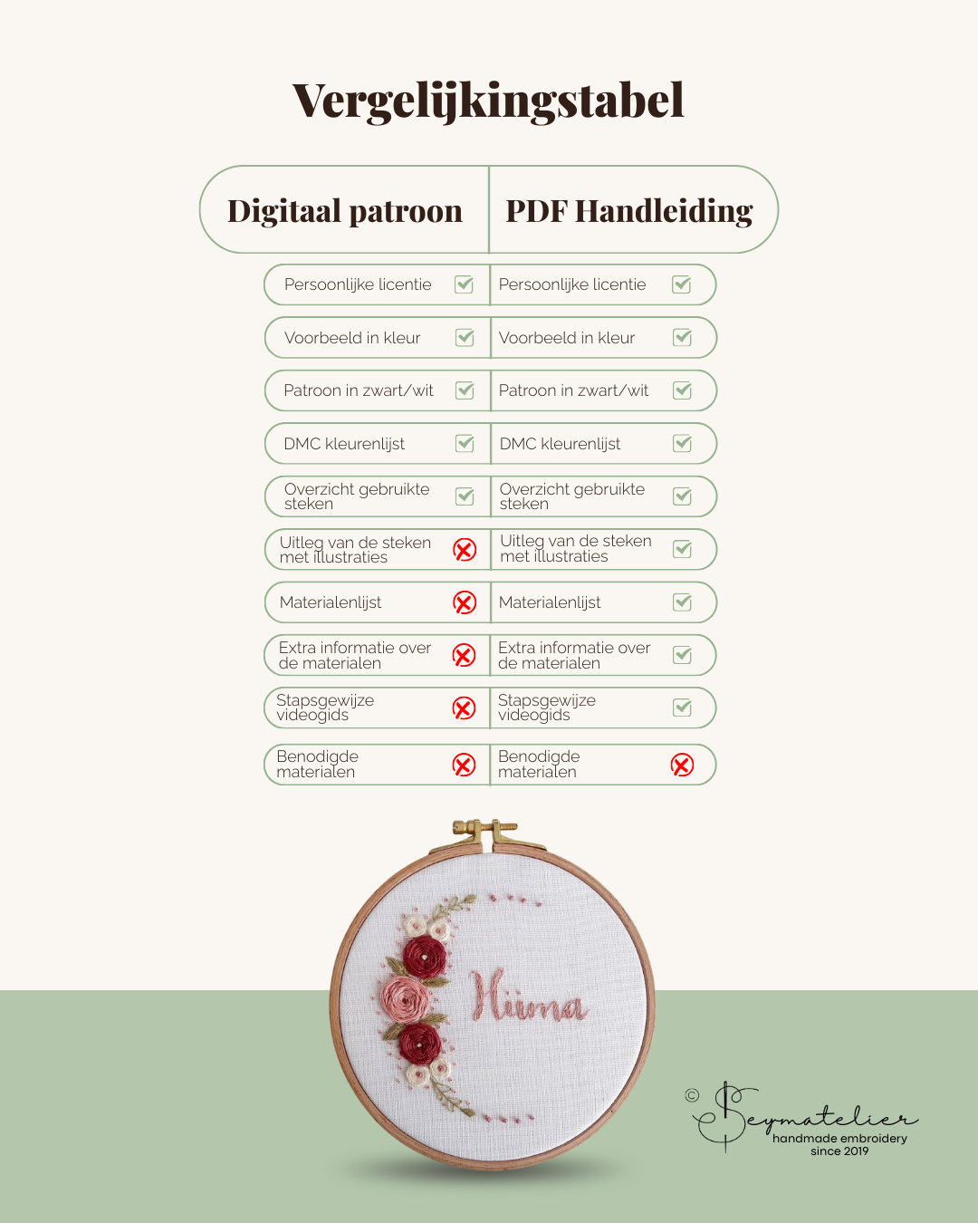 Met dit digitale borduurpatroon kun je meteen aan de slag! Het patroon is ontworpen voor zowel beginners als gevorderden en bevat een kleurenlegenda (DMC), gebruikte steektechnieken en een voorbeeld van het eindresultaat.
